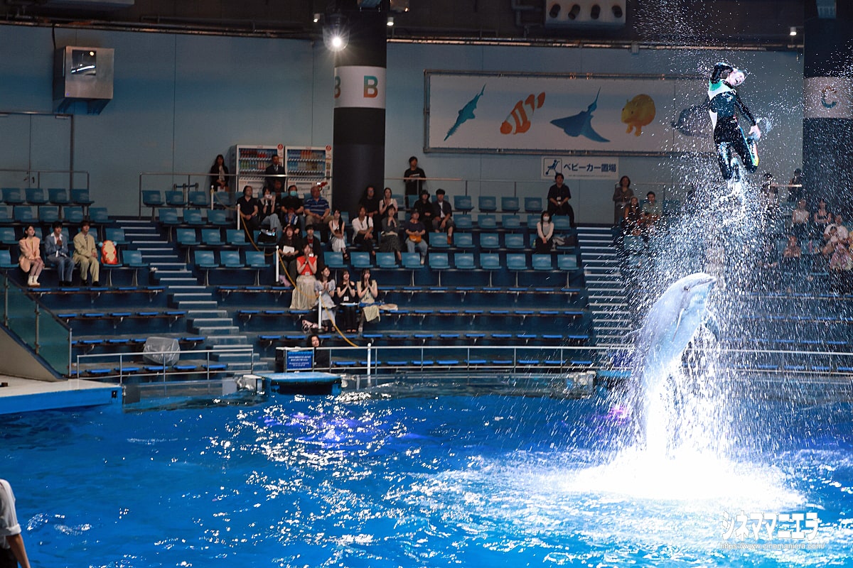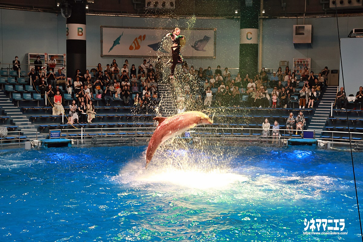 純粋で真っすぐな新時代のヒロイン・人魚姫のチャオが登場することから、マクセル アクアパーク品川とコラボした【スペシャルドルフィンパフォーマンス】が行われた。特別コラボの前には通常のドルフィンパフォーマンスが行われ、可愛さと見事なパフォーマンスに会場の熱気が急上昇。そんな中、今回の特別コラボを見届けるため、W主演を務めた鈴鹿央士(主人公・ステファン役)、山田杏奈(チャオ役)、人間と人魚の歴史を取材する新米記者・ジュノー役を演じた太田駿静が登壇すると、一段と大きな歓声が上がった。水族館での開催という貴重な機会になった今回イベントだが、トークコーナーでは水族館についての思い出やエピソードについての話題に。鈴鹿は、「最近は撮影でいくことが多いのですが、普段の撮影だとタイトな時間で急がなきゃいけないことも多い中で、水族館での撮影は心穏やかに、生き物に癒されながら撮影することができるので、(水族館で撮影があると聞くと)ヨシっと思います。」と回答。山田は、「小学生の時に家族で水族館に行った時に、イルカにタッチできる機会があったのですが、その時に茄子みたいな感触だったことが驚きで、夏休み明けに学校の友達に話しました!」とまさかのエピソードで会場の笑いを誘った。太田は「本当に小さい頃の話で、今は絶対やっちゃダメなんですが…」と前置きした上で、「水槽のガラスを叩いちゃったことがあり、親にとても怒られたことを思い出しました」と幼い頃のエピソードを明かした。