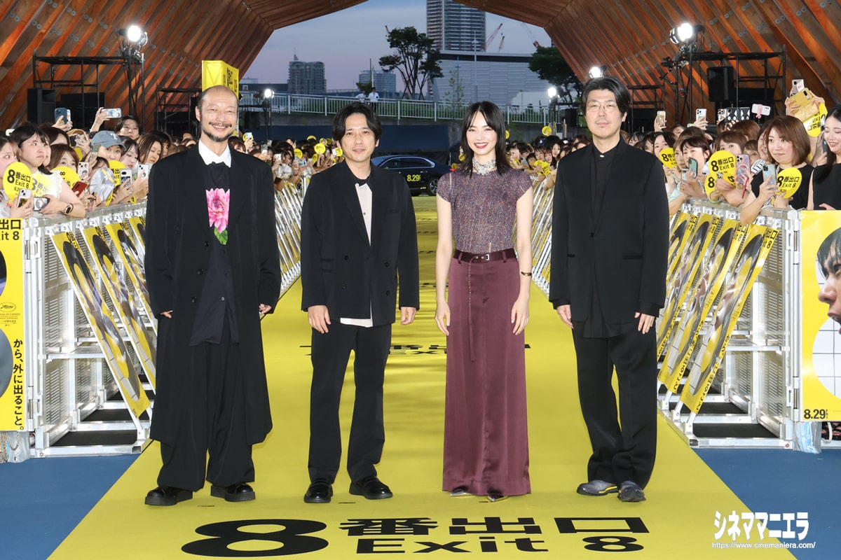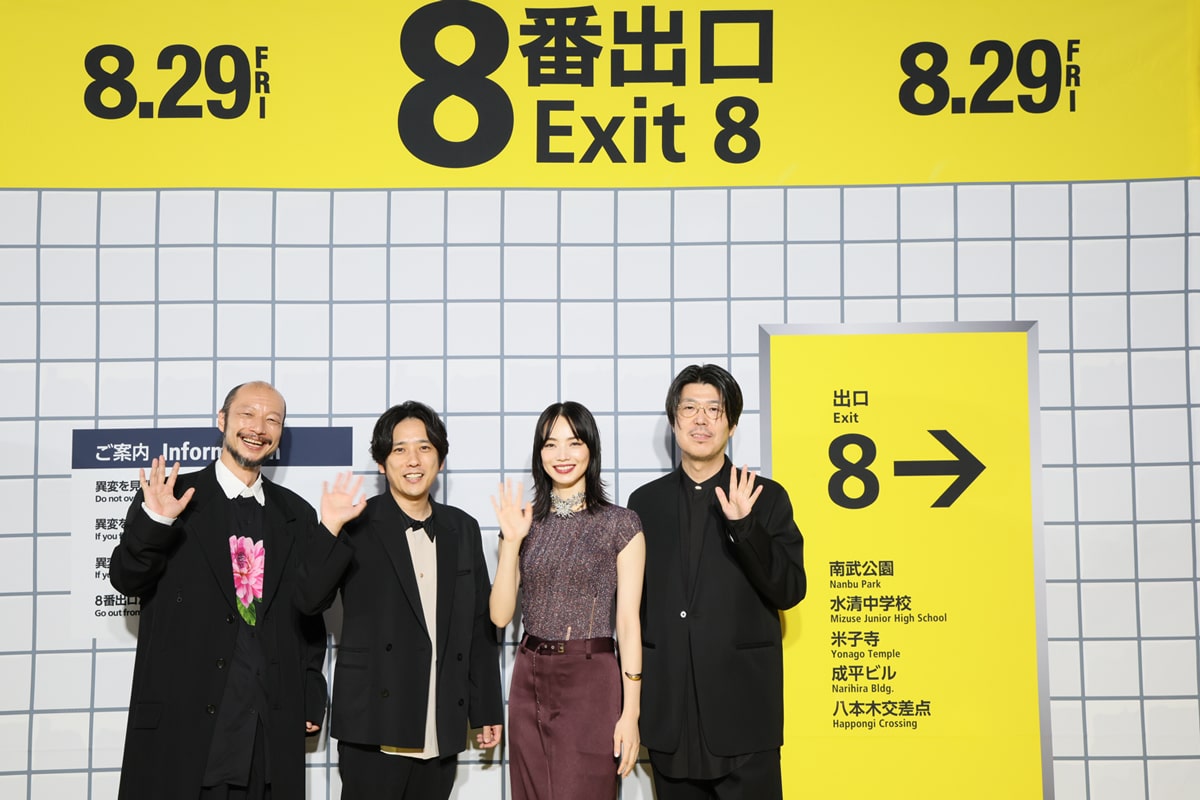 この日は、本作初の日本でのイベント。二宮たち4人は、88メートルの黄色カーペットに仕掛けられている8つの不可解な“異変”を探しつつ歩むことに。小松は、「異変探しに必死でした」と述べていたが、異変はカーペット上の番号1,2,3,5,6,7,8と「4」が抜けたこと、ステージ上のパネルの公開日29日の2が左右反転していること、ムービーカメラマンが短パン姿だったこと、トイレットペーパーが積み上がっていたこと、小松のマイクフラッグ(『8番出口』と記されている部分)だけ色が反転していることなどであった。