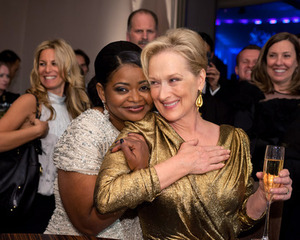 こちらの写真(cA.M.P.A.S.)は、受賞式後のパーティの様子です。本年の主演女優賞のメリル・ストリープ(右)と助演女優賞のオクタヴィア・スペンサーの喜びようが伝わってきますね。
