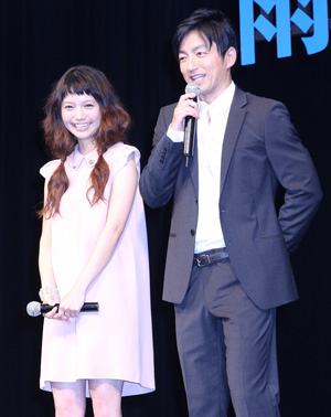 同作は細田監督によるオリジナルストーリーで、原作本も同時期に刊行している。女子大生の花(宮﨑)が、おおかみおとこ(大沢)と出会い恋に落ち、ふたりの子ども雨と雪を授かり、子育てに奮闘し成長を見守るという13年間を描くもの。そして、この日は、作品の世界観を再現し、ステージ上に雨と雪を降らせ、登壇者が相合傘で登場するという演出。