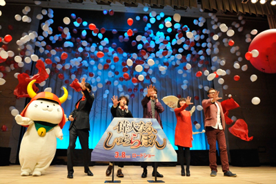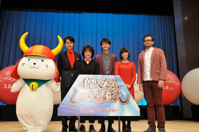 本作は『プリンセス・トヨトミ』『鴨川ホルモー』の映画化でも知られる万城目学の小説を基に、パワースポットである琵琶湖を舞台にしたアドベンチャームービー。本作のロケ地である滋賀県彦根市のキャラクターひこにゃんも祝いに駆けつけ、盛り上げた。濱田・岡田のかけ声「しゅらら~~~ぼん!!」で巨大バルーンが爆発し、中から無数の風船が空中に舞う演出も。