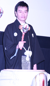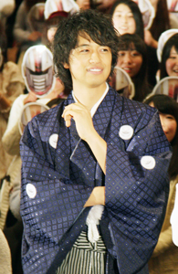 [シネママニエラ]藤ヶ谷太輔(Kis-My-Ft2)が初主演を飾る『劇場版 仮面ティーチャー』の完成披露プレミア上映会が東京・新宿の映画館で行われ、斎藤工、遠藤憲一と3名で、仮面だらけイベントと舞台あいさつを行った。仮面柄の樽を用いた“仮面(鏡)開き”を行うなど、仮面の紋付き羽織と袴という凛々しい姿でファンの前に立ち、大歓声を浴びた。