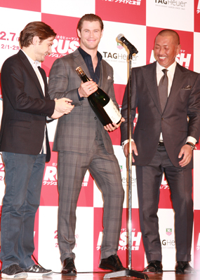 [シネママニエラ]豪俳優のクリス・ヘムズワースが1月28日、F1を題材にした映画『ラッシュ/プライドと友情』来日記者会見に共演の独俳優ダニエル・ブリュール、そしてロン・ハワード監督と出席した。クリスは劇中では最速男として優勝セレモニーのシャンパンファイト場面を経験しているが、この日の会見では益々繁盛ボトル(二升半入り)を抱え、ご満悦の様子だった。