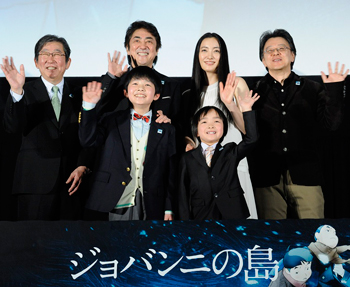 [シネママニエラ]忘れてはいけないことをテーマにした感動のアニメーション映画『ジョバンニの島』が2月22日に公開初日を迎え、声を務めた市村正親(瀬能辰夫役)、仲間由紀恵(佐和子先生役)、横山幸汰(瀬能純平役)、谷合純矢(瀬能寛太役)、原作・脚本の杉田成道、西久保瑞穂監督が東京・新宿ピカデリーで上映後の舞台あいさつを行った。