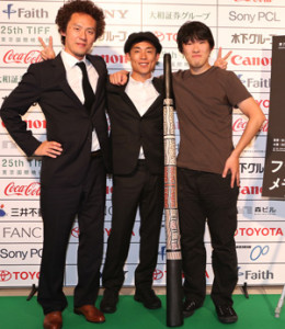 第25回東京国際映画祭コンペ部門『フラッシュバックメモリーズ 3D』の記者会見が六本木ヒルズのムービーカフェで行われ、同作主演のディジュリドゥアーティストのGOMA、松江哲明監督、高根順次プロデューサーが質疑に応じた。