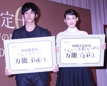 [シネママニエラ]映画『万能鑑定士Q -モナ・リザの瞳-』の公開直前・鑑定イベントに、綾瀬はるかと松坂桃李が出席。顔相鑑定士の池袋絵意知さんと心理鑑定士の春香葉子さんによる公開鑑定が行われ、綾瀬は万能保育士、松坂は万能消防士が適職であると診断された。