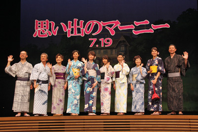 [シネママニエラ]スタジオジブリの映画『思い出のマーニー』の完成披露試写会が7月2日、東京国際フォーラムにて行われ、高月彩良、有村架純、松嶋菜々子、黒木瞳、寺島進、根岸季衣、森山良子、主題歌を担当したプリシラ・アーン、麻呂こと米林宏昌監督が出席し上映後の舞台あいさつを行った。