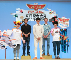 [シネママニエラ]映画『プレーンズ2/ファイアー&レスキュー』のボブス・ガナウェイ監督とフェレル・バロンプロデューサーが来日し、日本語吹替え版を務めた俳優の瑛太(ダスティ役)とハリセンボンの近藤春菜(ディッパー役)と箕輪はるか(パインコーン役)も駆け付けてスタジオアルタにて記者会見を行った。